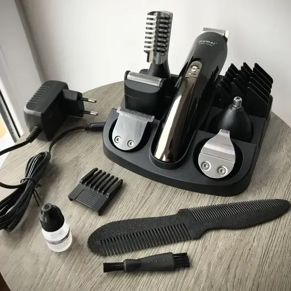 Набір для стрижки волосся , являє собою універсальну машинку для стрижки з 11 насадками. Дві насадки для стрижки ширини, насадки регулювання довжини 3-12 мм, тример для носа, дизайнерський тример, вузький тример, сіткова бритва, насадка 3-4,5 мм. Насадки з нержавіючої сталі, вбудований акумулятор і індикатор заряду. Відмінний набір на всі випадки життя, замість декількох приладів Вам достатньо мати один такий.